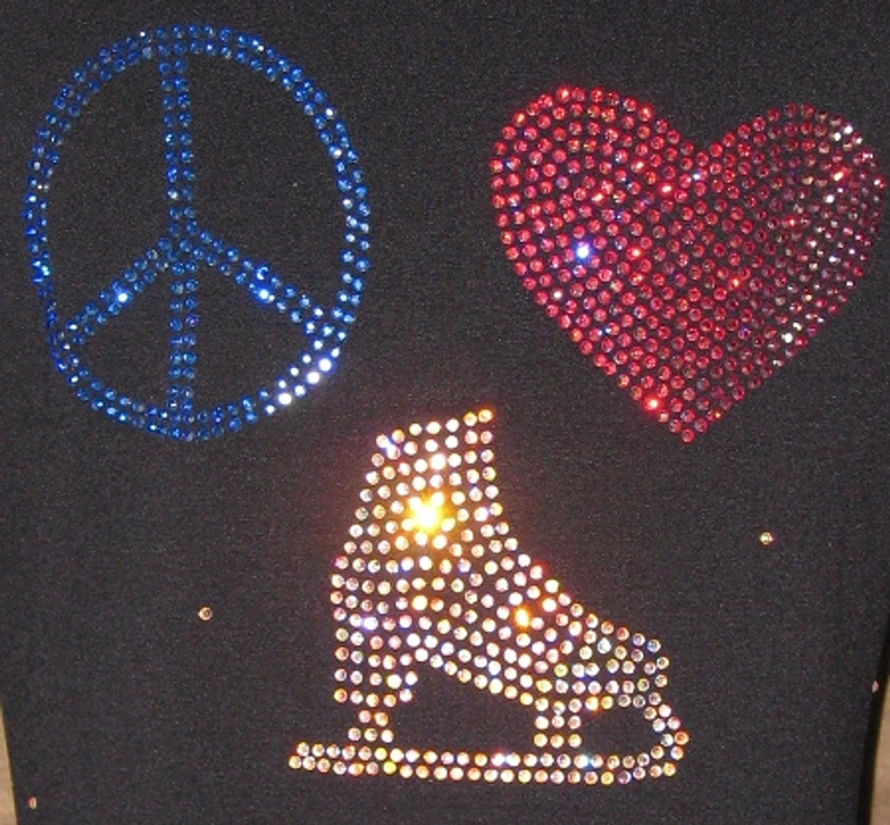 Polartec power stretch ice skating jacket with crystal applique: over 400 Czechoslovakian rhinestone size ss10 Peace AB Saphire (blue) color, Love – AB Fuchsia/Red color, Skate – AB Crystal color. Great for every day practice and competition event. Fitted style without a hood and high performance polartec fabric ideal for ice skating that demand freedom of movement, moisture management, and warmth.