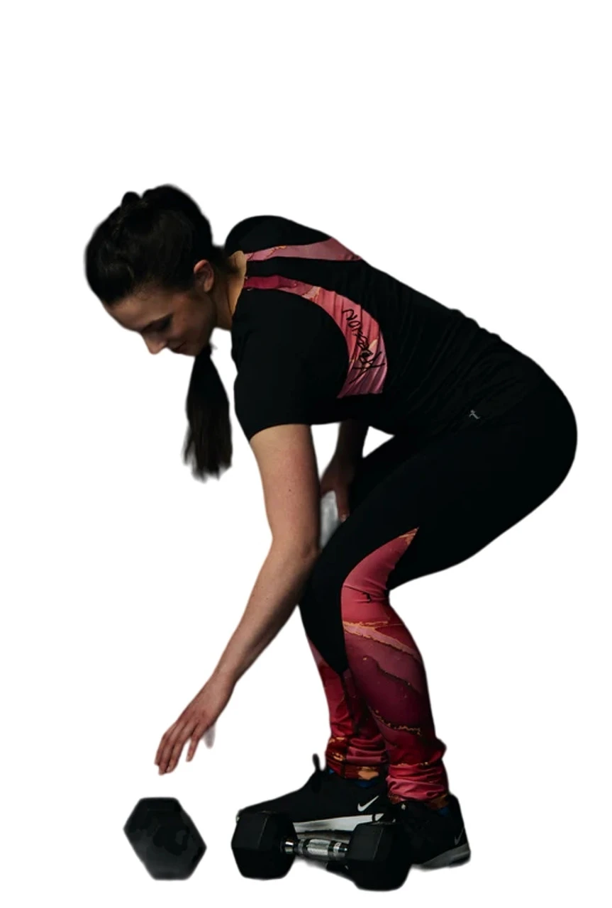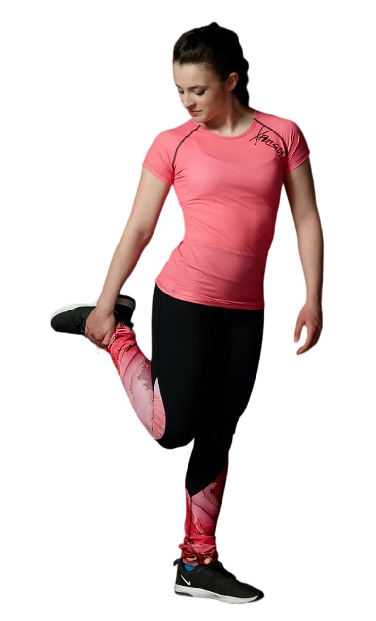 Black supplex legging with inserts sublimated with marbled coral color by Elite Xpression